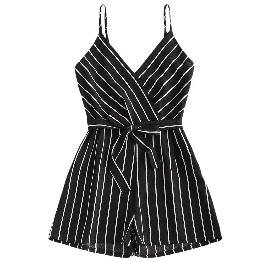 Womens V-Neck Sleeveless Strappy Holiday Short Playsuits Striped Cami Belt Romper Jumpsuit